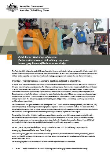 In August 2014, the United Nations (UN) Security Council declared the Ebola virus outbreak in the West African subregion a ‘threat to international peace and security’. The UN’s request for assistance from member states resulted in the mobilisation of technical expertise, medical capacity, humanitarian assistance, and military and civil defence assets. The Australian Government contributed approximately $45 million to the international Ebola response, including the management of an Ebola treatment centre in Sierra Leone contracted to Aspen Medical, and a regional Ebola response preparedness package focused on the Asia Pacific. Other countries, including affected states, responded in a variety of ways, some through civilmilitary intervention. The United States (US) and United Kingdom (UK) provided a civil-military health response in Liberia and Sierra Leone respectively.